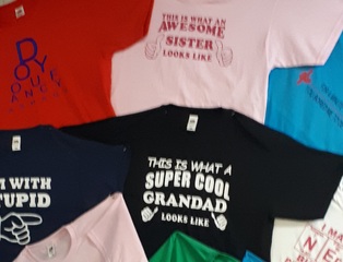 Tee Shirts- We offer a vinyl print service and can print any text on our range of Fruit of the Loom tee shirts. If you would like to provide your own shirt we can print that too but please speak to us first to make sure the material and shirt design are printable.